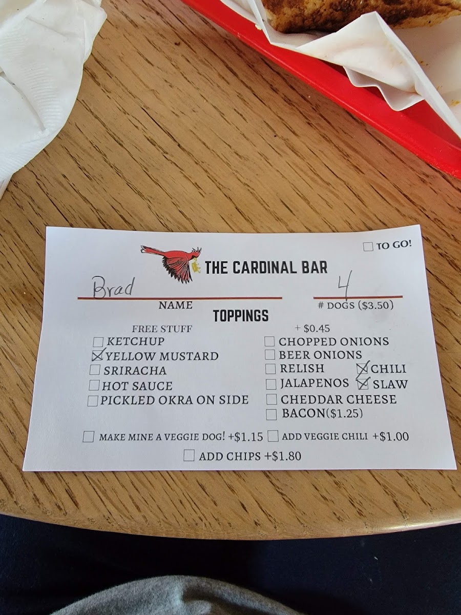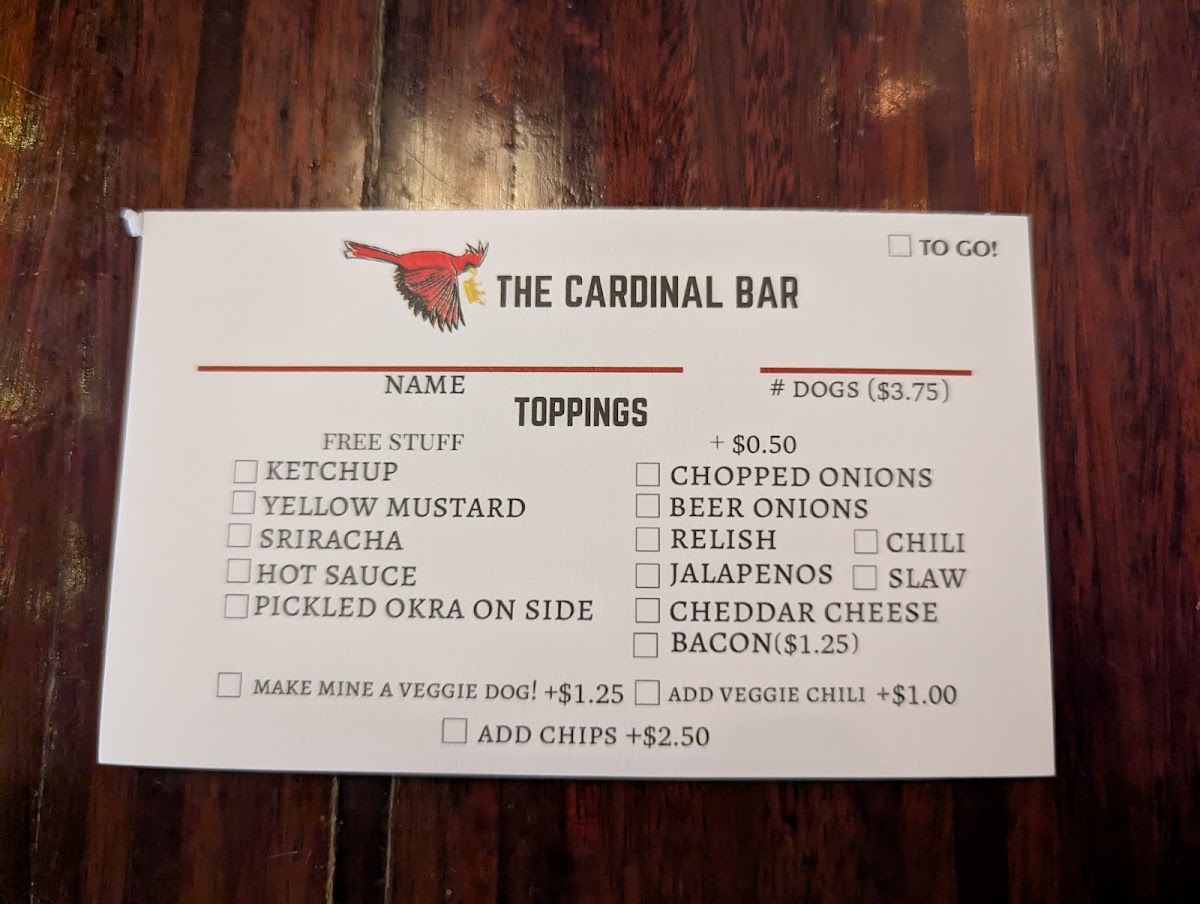 Introducing "The Cardinal Bar," nestled in the heart of Raleigh, NC, this bar is a gem for hot dog enthusiasts and casual drinkers alike. Renowned for its friendly and professional staff, The Cardinal Bar offers a unique twist on classic hot dogs. Customers rave about their signature toasted buns, reminiscent of a lobster roll, perfectly complemented by finely chopped onions and jalapeños for a burst of flavor.